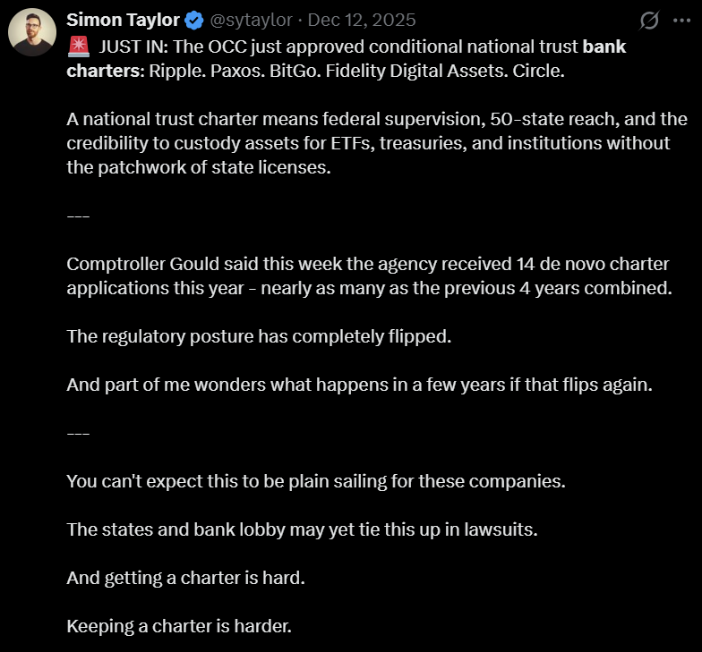 More recently, Trump-affiliated World Liberty Financial submitted its own application for a national bank charter, adding to the growing list of crypto and fintech companies seeking entry into the US banking system.