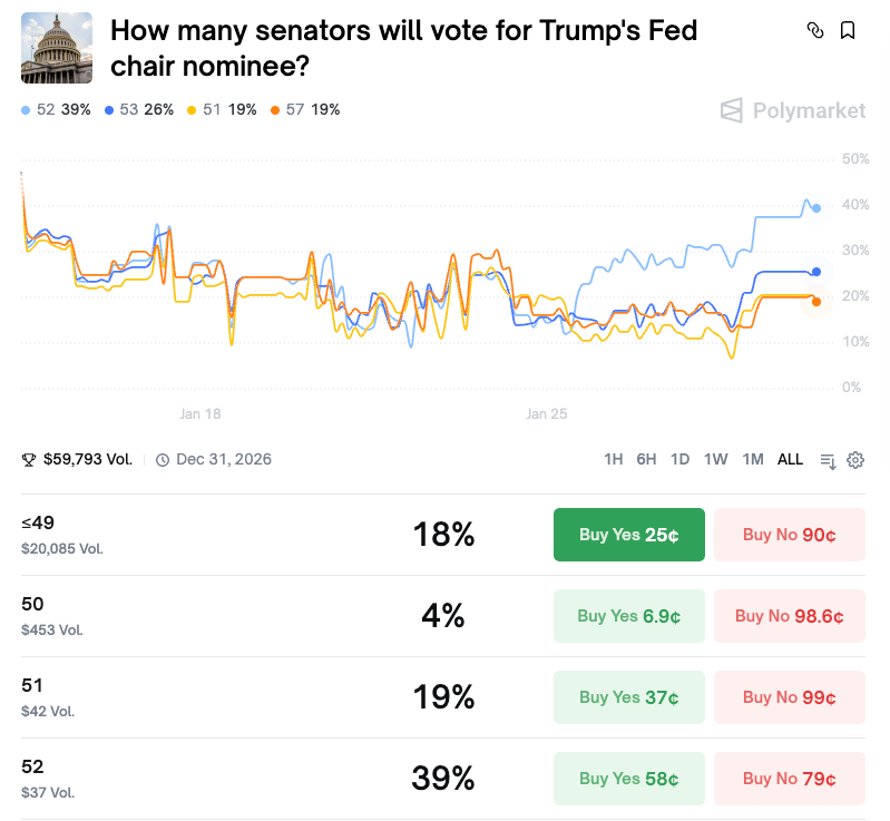 While Warsh’s nomination appears likely, confirmation is less certain. Polymarket shows a 39% chance of passing with exactly 52 votes—the most likely scenario—while an 18% probability of outright rejection reflects uncertainty over Senator Tillis’s threatened blockade.