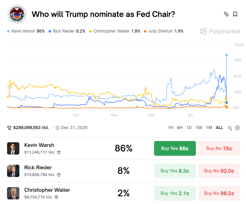Former Fed Governor Kevin Warsh emerged as the clear frontrunner following a White House visit on Thursday. Prediction markets shifted dramatically. Polymarket showed Warsh at 87% probability on $289 million in trading volume. Kalshi reflected similar odds at 86% on $74 million volume.