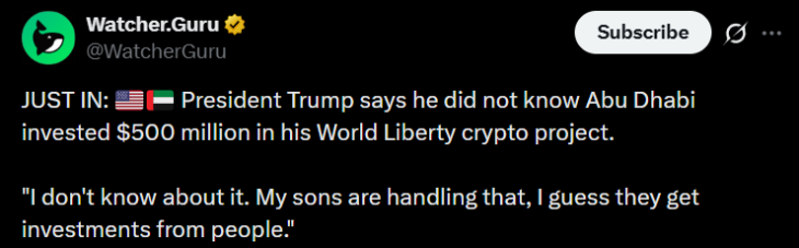 • In the press conference, U.S. President Trump shared a comment on a $500 million investment from Abu Dhabi into his World Liberty Financial