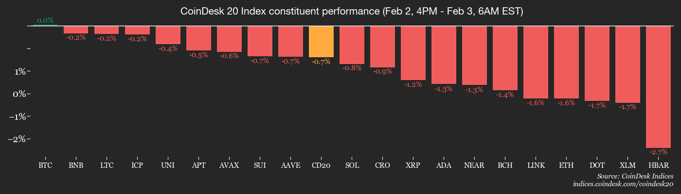 - $BTC is down 0.1% from 4 p.m. ET Monday at $78,400.52 (24hrs: +0.9%)