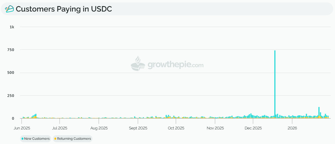 Still, growthepie’s dashboard shows limited repeat usage, with most wallets transacting only once. A “returning customer,” Lehmann explained, is defined as a wallet making a payment on a different day after its first transaction, with wallet addresses representing a lower bound for actual users.