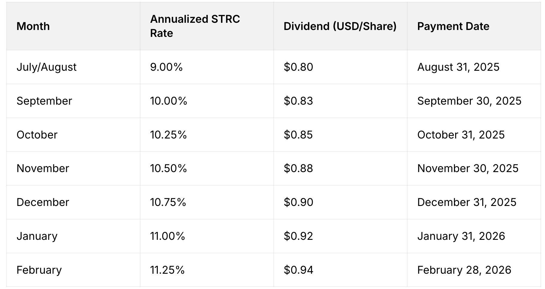 STRC dividends went up every single month since launch. In July and August, the rate was 9.00%, with a $0.80 payout. That jumped to 11.25%, with February’s payment set at $0.94 per share.