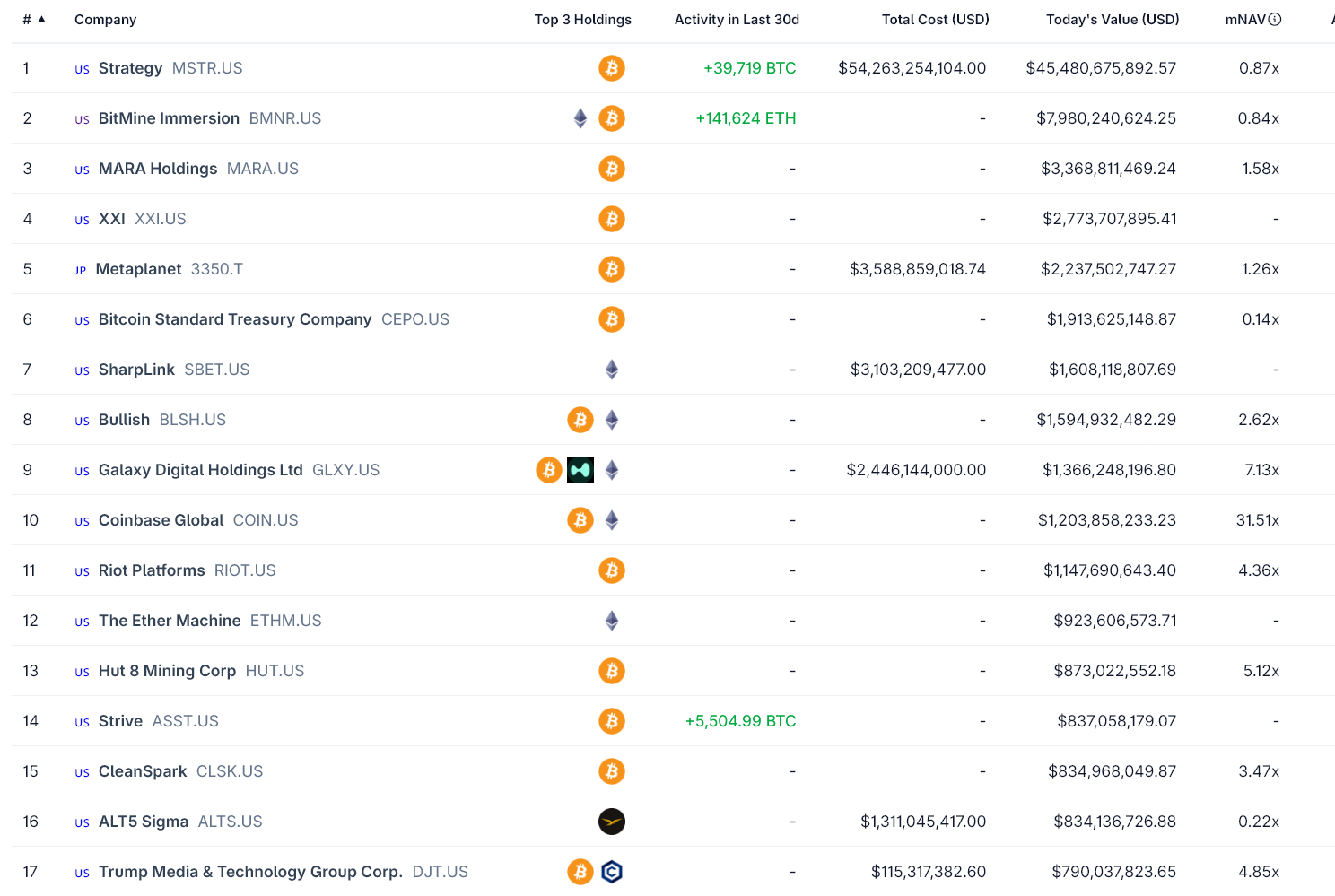 Several major treasury firms now trade below an mNAV of 1, meaning the market values their equity at a discount to the assets they hold. This eliminates the ability to raise capital efficiently through equity issuance without dilution.
