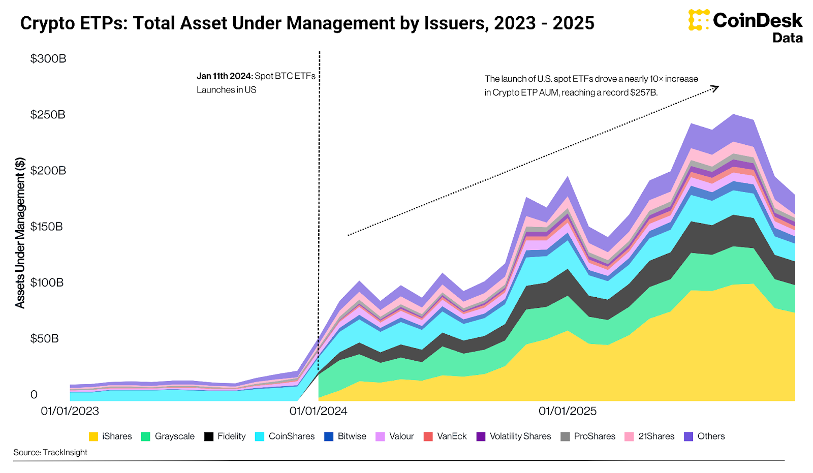 Digital asset Exchange-Traded Products (ETPs) are now one of the clearest signals of how quickly crypto is being integrated into traditional portfolio infrastructure. As presented in CoinDesk’s latest research report, the market has moved beyond the early phase of fragmented access and into a period where regulated wrappers and exchange-traded fund (ETF) distribution are materially shaping how capital enters the asset class.