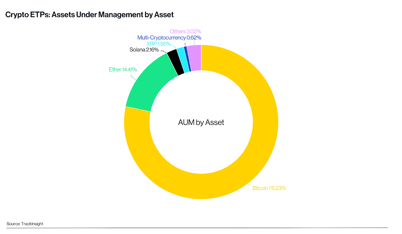Within the crypto ETP market, exposure remains heavily concentrated. Bitcoin-based products account for $144 billion in AUM, representing 78.2% of total AUM. Ether-based products have reached $26.5 billion, indicating that institutional demand is gradually broadening beyond bitcoin. Outside of those two assets, exposure remains limited. Solana- and $XRP-linked products manage $3.8 billion and $3.0 billion respectively, while multi-cryptocurrency ETPs represent 0.62% of total AUM, or $2.16 billion.