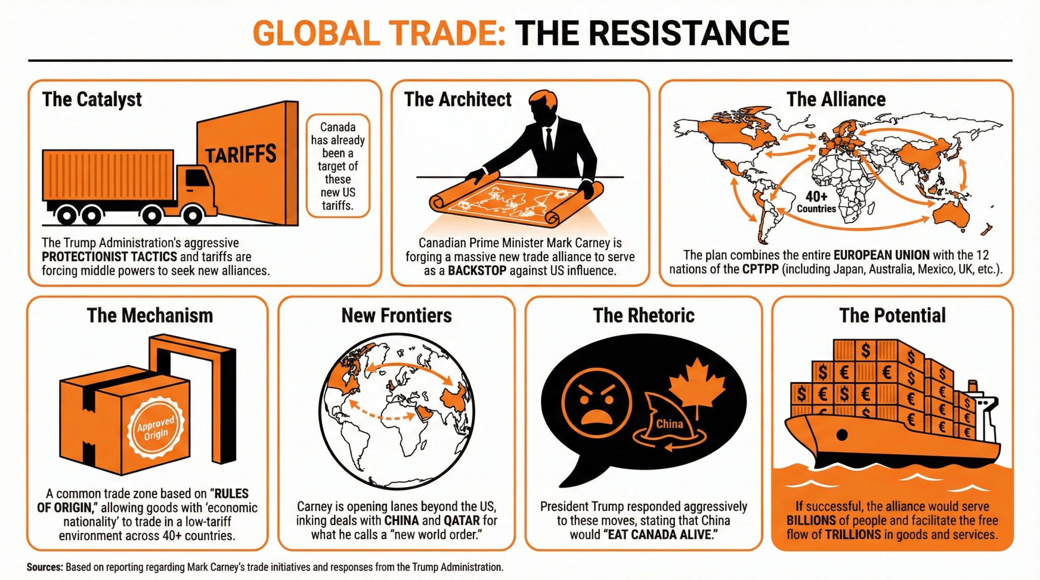 Mark Carney, Prime Minister of Canada, is reportedly making moves to forge a new trade alliance that would combine the whole EU and the 12 countries of the Comprehensive and Progressive Agreement for Trans-Pacific Partnership, including Australia, Brunei Darussalam, Canada, Chile, Japan, Malaysia, Mexico, New Zealand, Peru, and the U.K.