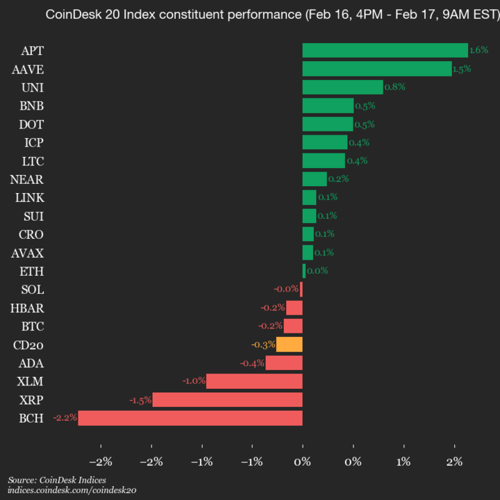 Leaders: APT (+1.6%) and AAVE (+1.5%).