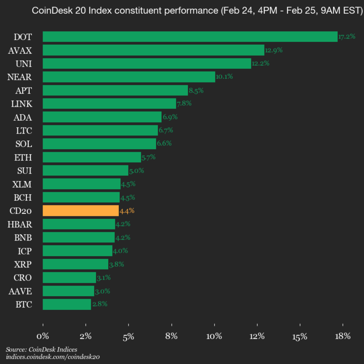 Leaders: DOT (+17.2%) and AVAX (+12.9%).