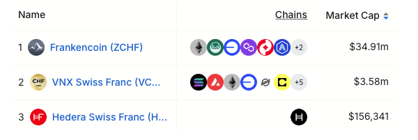 According to data from DefiLlama, there are at least three CHF‑denominated stablecoins, including Frankencoin (ZCHF), VNX Swiss Franc (VCHF) and Hedera Swiss Franc (HCHF). The combined market capitalization of these coins is about $38.6 million.