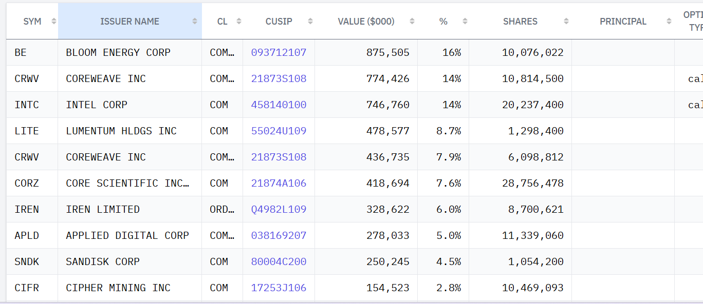 The fund’s 13F filing for Q4 2025 shows a highly concentrated portfolio built around betting that the real winners of the AI boom won’t be chatbots, but the power plants and data centers that feed them. Situational Awareness reported $5.52 billion in US equity positions across 29 holdings, with a large share of that value clustered in a handful of AI infrastructure names.