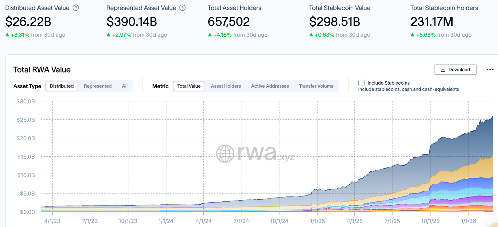 On RWA.xyz’s dashboard, the represented asset value now sits around the $390B range, close enough to the $400B headline to change how the market reads the category.