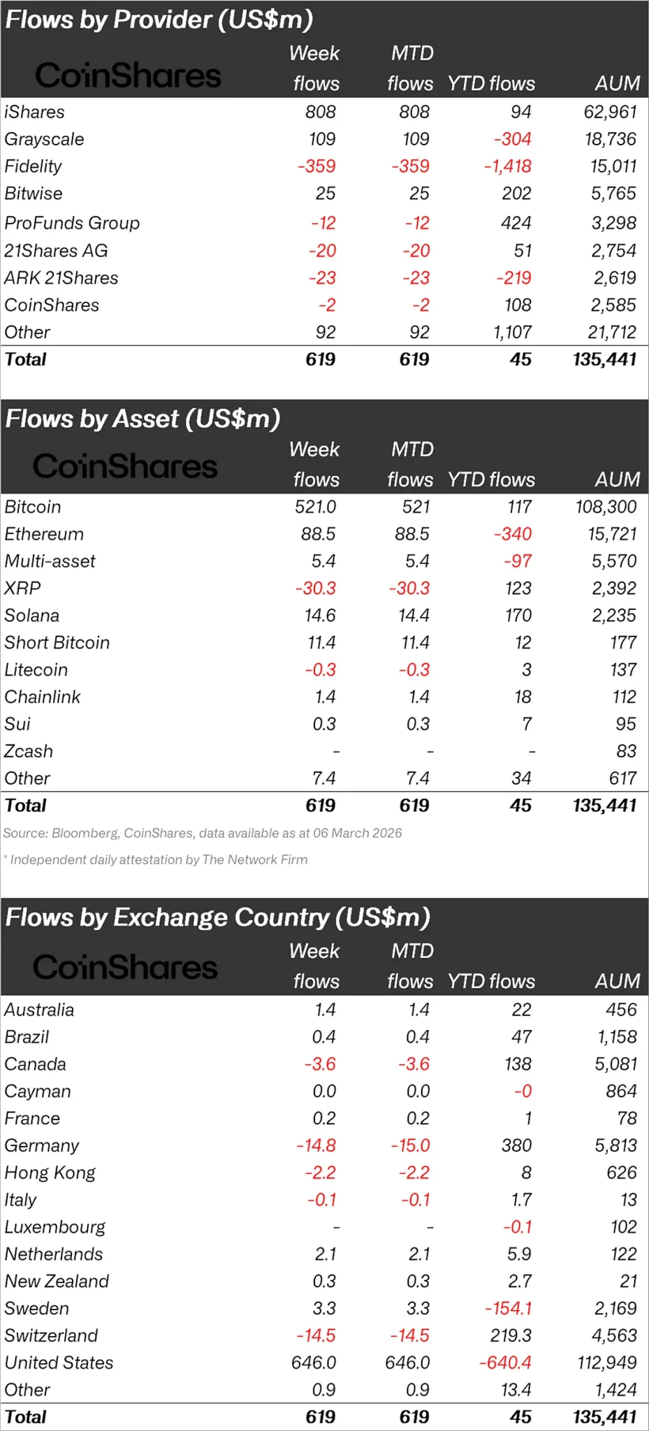 “There was a $619 million inflow into cryptocurrency investment products. Strong demand at the start of the week was offset by outflows at the end of the week due to rising oil prices despite weak employment data.”