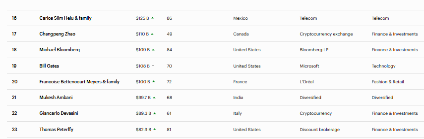 Crypto entrepreneur Changpeng Zhao has jumped up in the list of the world’s richest individuals. According to Forbes, his estimated net worth is now around $110 billion, placing him 17th on the global rich list.
