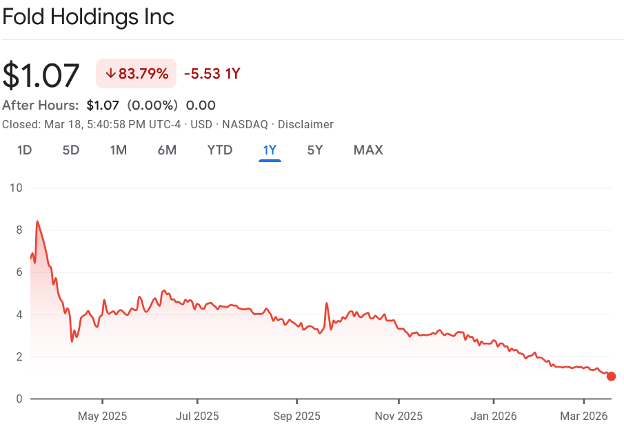 The Bitcoin selloff comes as Fold (FLD) shares have now fallen 59% so far in 2026 and 83.8% over the last 12 months, Google Finance data shows.
