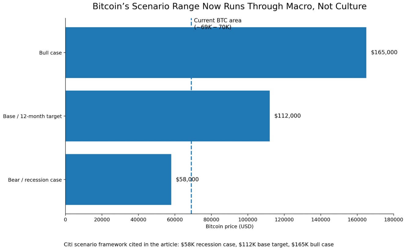 Citi's current scenario framework sets the financial stakes. Its 12-month Bitcoin target sits at $112,000, revised down from $143,000. The bull case reaches $165,000. The bear case lands at $58,000.