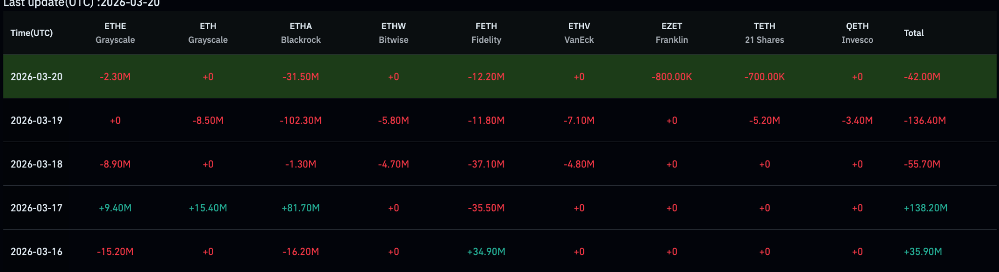 However, sentiment shifted sharply in the second half of the week. The investment giant recorded outflows of approximately $33.9 million on March 18, followed by $38.3 million on March 19.