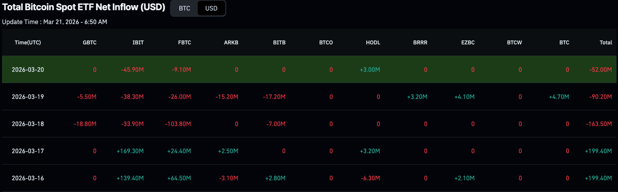 The trend then reversed, with a sharp $163.5 million outflow on March 18, followed by $90.2 million on March 19 and a smaller $52 million outflow on March 20. This shift suggests that while institutional interest remains, it is increasingly sensitive to short-term price movements and market conditions.