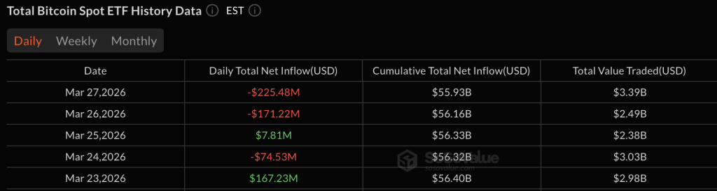 Bitcoin ETFs recorded a steep $225.48 million in net outflows, marking one of the largest single-day withdrawals of the week. The selling was concentrated, but decisive. Blackrock’s IBIT accounted for the overwhelming majority, shedding $201.53 million alone. Bitwise’s BITB followed with $18.60 million in outflows, while Ark & 21Shares’ ARKB posted a smaller $5.35 million exit.