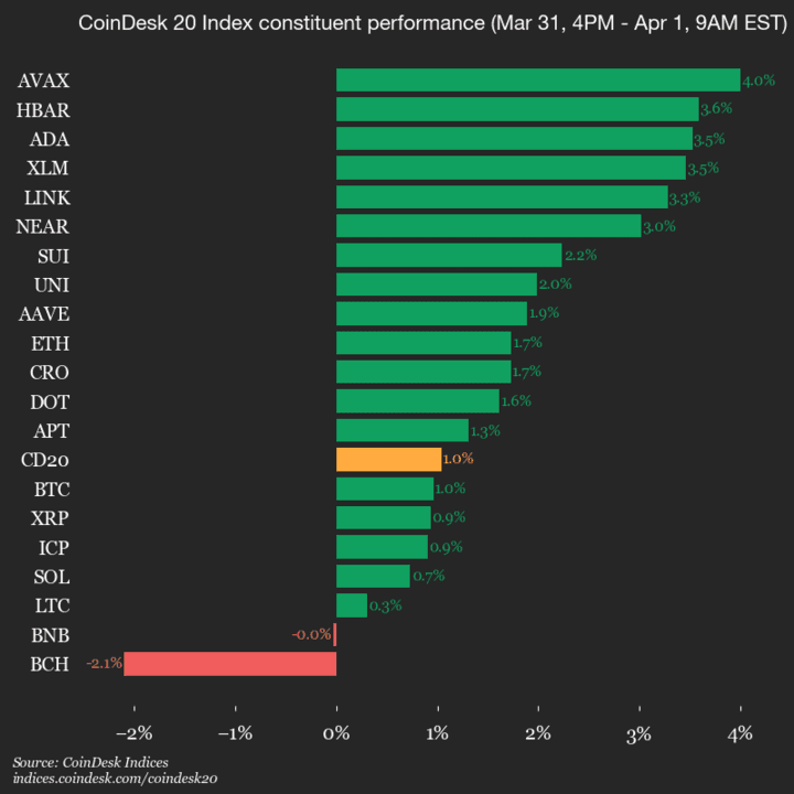 Leaders: AVAX (+4.0%) and HBAR (+3.6%).