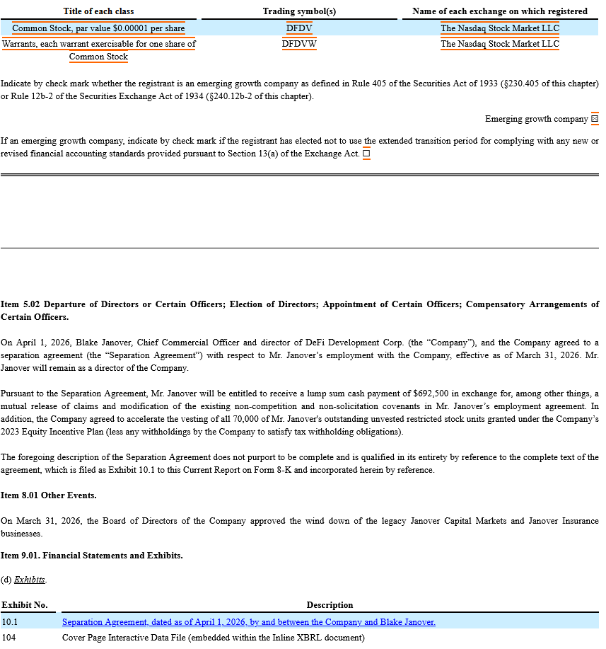 DeFi Development Corp. (NASDAQ: DFDV) has filed a Form 8-K with the U.S. Securities and Exchange Commission, disclosing the departure of Chief Commercial Officer Parker White alongside additional corporate developments.