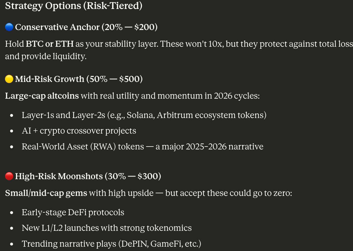 Against this backdrop, Claude AI proposed a diversified, risk-tiered strategy to balance capital preservation with upside potential.