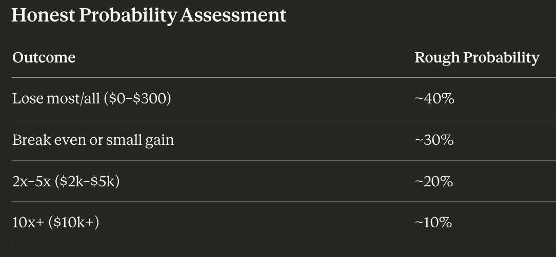 Despite the structured approach, Claude AI assigns a 40% chance of major losses, a 30% likelihood of breaking even or achieving modest gains, and just a 10% probability of reaching the $10,000 target.