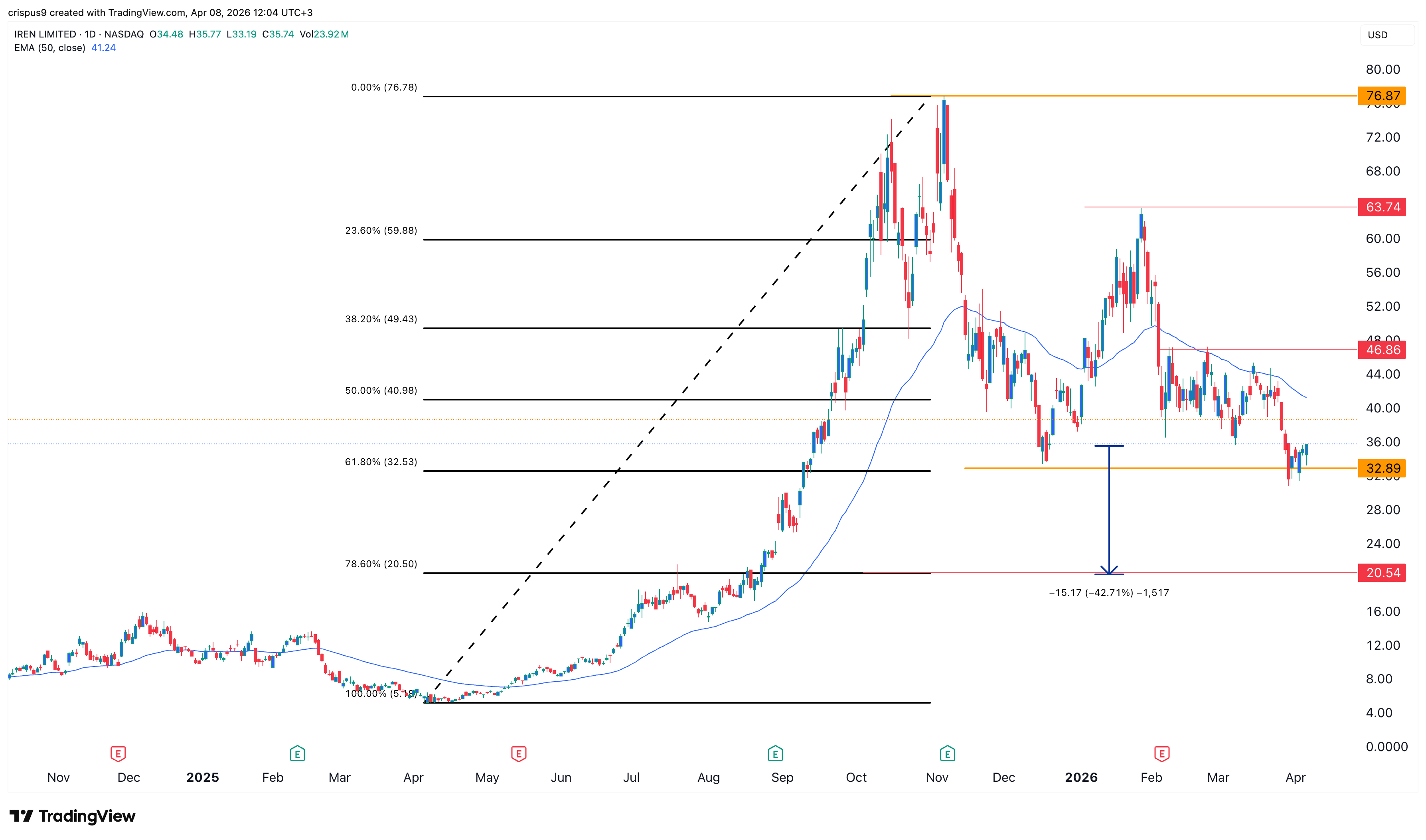 The daily chart shows that the IREN stock price has crashed in the past few months, moving from a high of $76.50 in November last year to the current $35