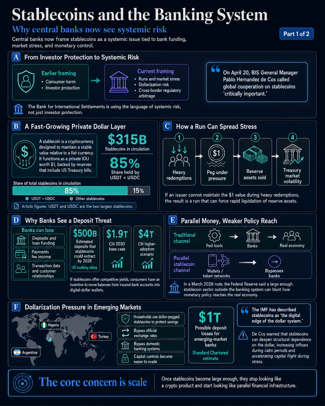 The Federal Reserve, in a March 2026 note on payment stablecoins and cross-border payments, added a further complication: a large enough stablecoin sector outside the banking system can blunt how monetary policy reaches the real economy, because the Fed's tools work through banks, and a parallel network that bypasses them weakens their reach.