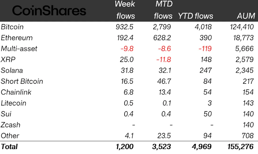 Bitcoin led last week’s ETP inflows, drawing $932.5 million and lifting year-to-date flows to $4 billion. A large share of these inflows came from US-listed spot Bitcoin exchange-traded funds, which recorded about $824 million in inflows last week, according to SoSoValue.