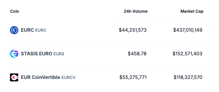 Issued by Circle Internet Financial Europe, the Paris-based arm of $USDC issuer Circle, $EURC is the largest euro-pegged stablecoin on the market. It currently accounts for about 49% of the $887 million euro-pegged stablecoin market cap, according to CoinGecko