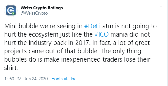 The agency has also called DeFi a mini bubble. It stated that some good projects may emerge from it, as happened with the ICO boom. However, Weiss Crypto Ratings warned the community that many inexperienced traders may lose their money.