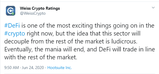 Major financial agency Weiss Ratings seems to be skeptical of the theory that in the future the DeFi sector will disconnect from the rest of the crypto market.