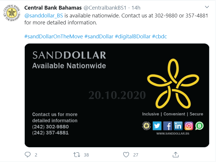 The Central Bank of The Bahamas announced the official launch of Sand Dollar just a few hours ago on its Twitter.