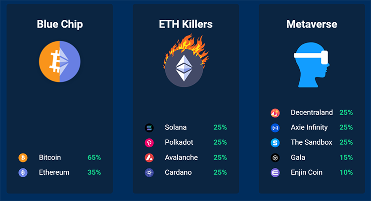 - Each customer’s personal portfolio is diversified across a chosen basket of cryptocurrency baskets, or themes, such as ‘Blue Chips’, ‘Ethereum Killers’, or ‘the Metaverse.’ The investment menu is designed to meet the various goals and interests of a broad investor base.