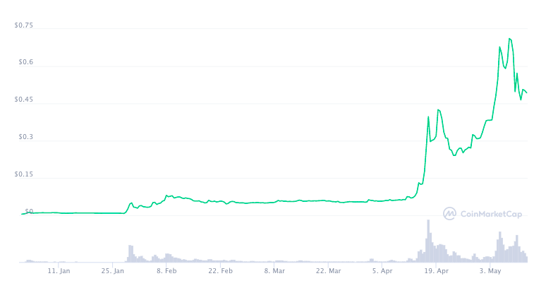 Dogecoin has been repeatedly recording major milestones recently, outstripping the largest cryptocurrency Bitcoin (BTC) in the number of related internet search queries. Since the beginning of 2021, Dogecoin has emerged as the fastest-growing digital currency, posting up to 13,500% growth year-to-date, surging from just $0.005 to an all-time high of $0.68 on May 7, according to data from CoinMarketCap.