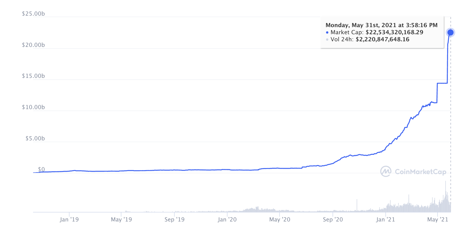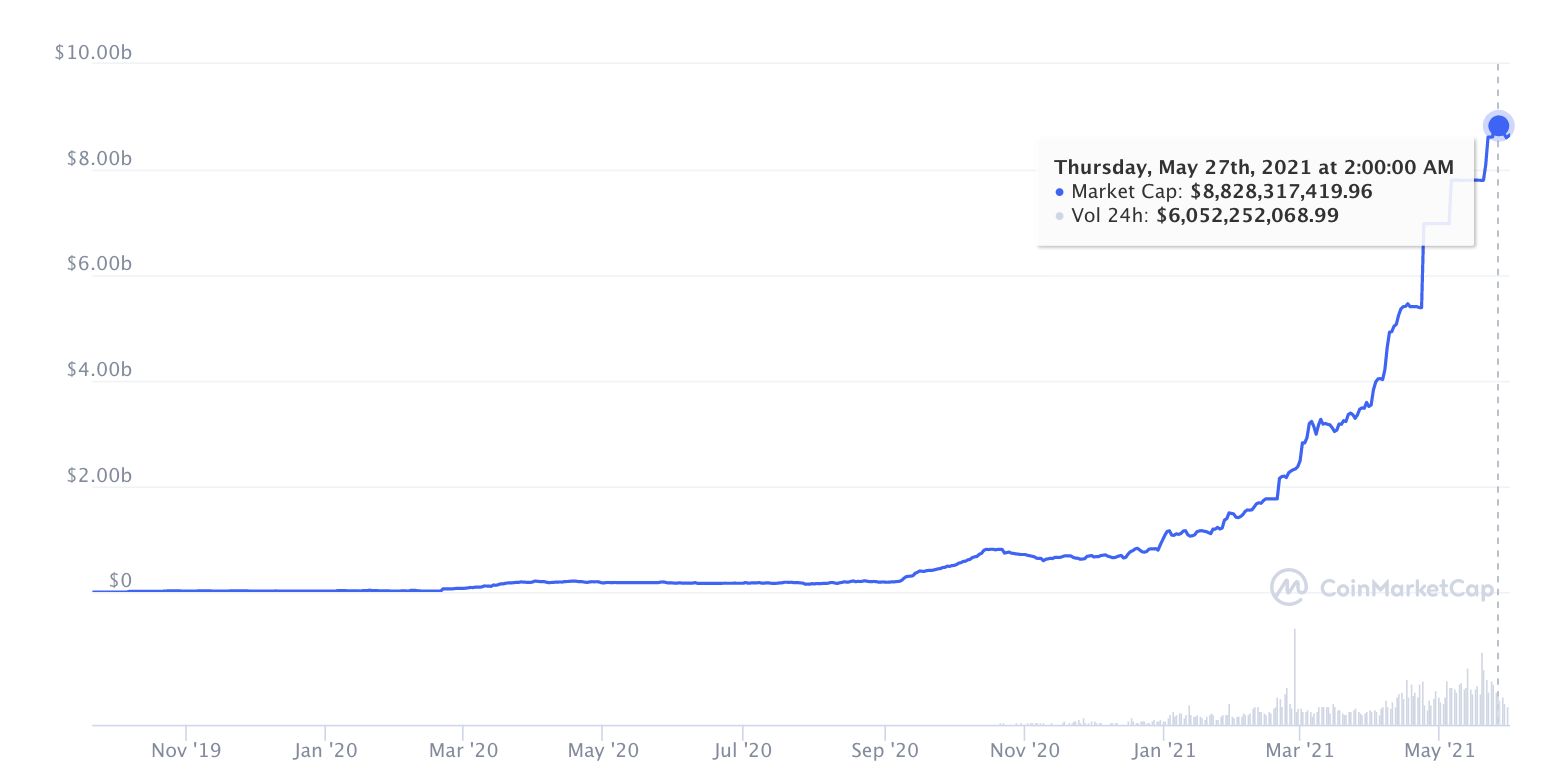 A newcomer has jumped to $10 billion in the same timeframe. Binance’s bUSD was not even on the radar last year, opening 2020 at less than $20 million. Now it’s close to $10 billion.