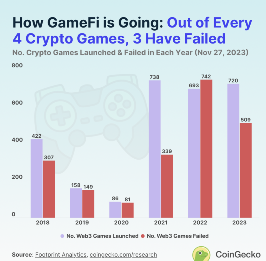 According to a recent report from CoinGecko, the average annual failure rate stands at a significant 80.8% from 2018 to 2023. The report highlights the challenges faced by these blockchain-based games.