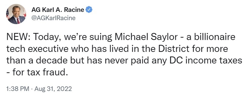 The District’s lawsuit alleges that Saylor avoided paying more than $25 million in D.C. income taxes by claiming to be a Florida or Virginia resident, Attorney General Racine noted, concluding: