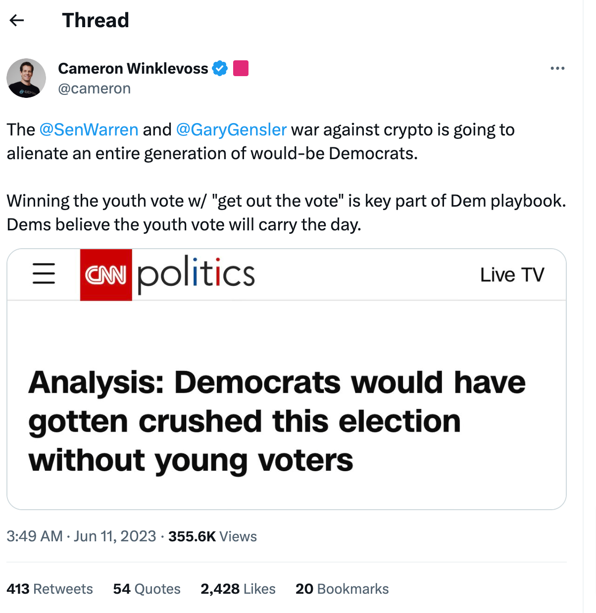 The Winklevoss twins, founders of Gemini exchange (1), emphasize the significance of engaging with the crypto community and understanding its needs and aspirations. They believe that a more nuanced approach to cryptocurrency regulation, focusing on fostering innovation while addressing legitimate concerns, would be more appealing to young voters and align with their desire for technological progress and financial freedom.
