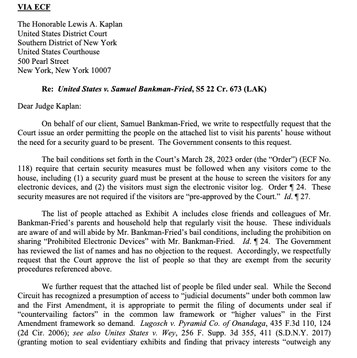 In a July 13 letter to New York District Court Judge Lewis Kaplan, lawyers representing Bankman-Fried requested the judge allow “close friends” on a submitted list to visit him without needing to go through court-ordered security measures set out in his bail conditions.