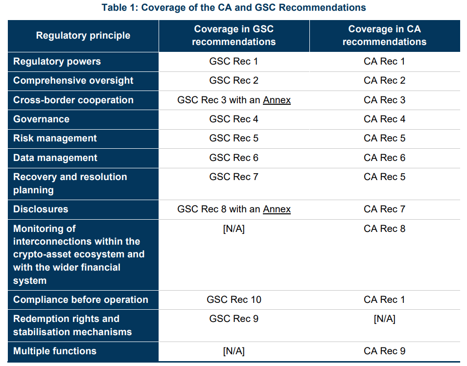 In total, the FSB accounted for 12 regulatory principles, divided between the aforementioned global stablecoin (GSC) and crypto-asset (CA) recommendations.