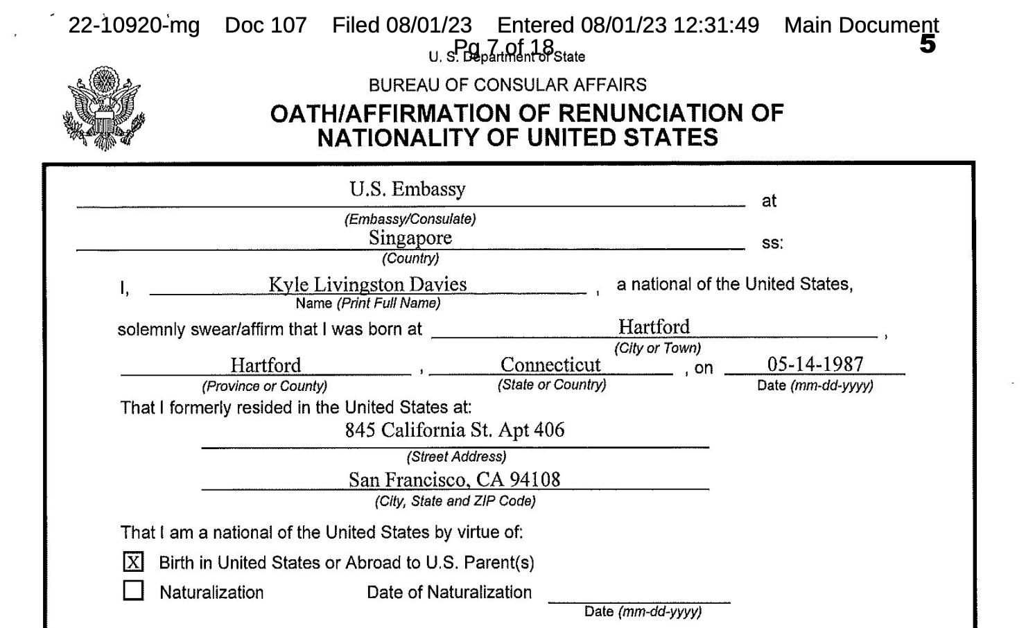 In an Aug. 1 filing with U.S. Bankruptcy Court for the Southern District of New York, Davies provided notarized and Apostilled copies of the form applying for the renunciation of his U.S. citizenship on Dec. 15, 2020. He claimed to have received citizenship to Singapore following the issuance of a passport in January 2021 and was not “subjecting [him]self to, or accepting the jurisdiction of, the Courts in the United States.”