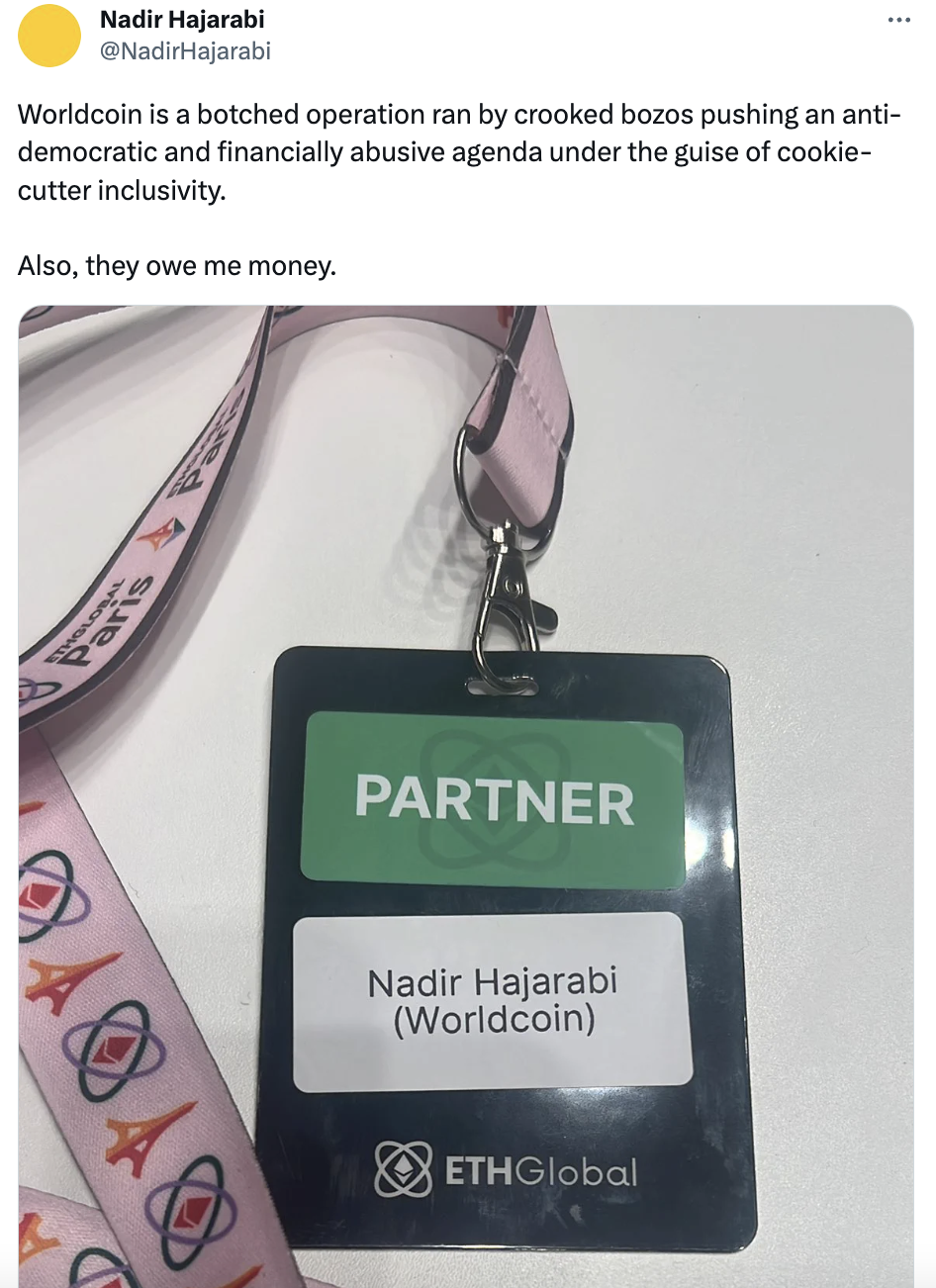 Cointelegraph was unable to independently verify Hajarabi’s claims, though a photo posted to X appeared to show them with one of the project's iris-scanning orbs. Their YouTube channel, created in September 2013, featured only one video with the allegations against Worldcoin. An X account which appeared to be controlled by the same individual posted a photo of an ETHGlobal Paris badge with Hajarabi’s name and affiliation with Worldcoin.