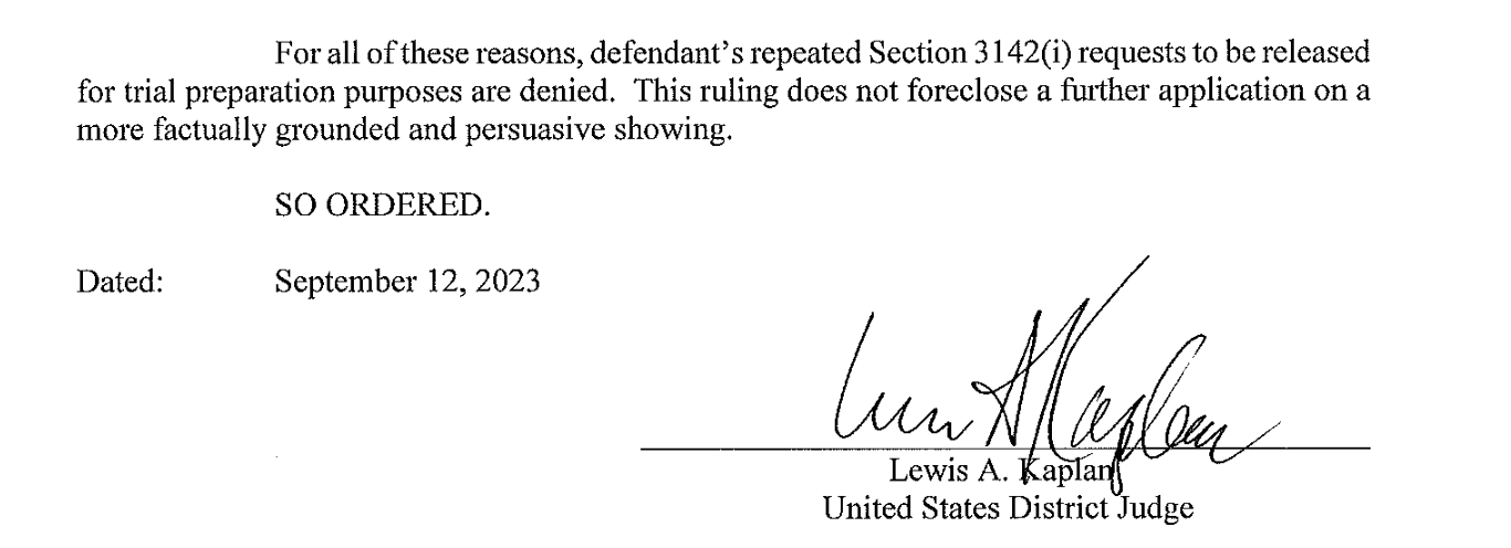 Judge Lewis A. Kaplan explained on Sept. 12 that Bankman-Fried's lack of internet access in prison to prepare for his upcoming trial wasn't a sufficient ground to grant his temporary release.