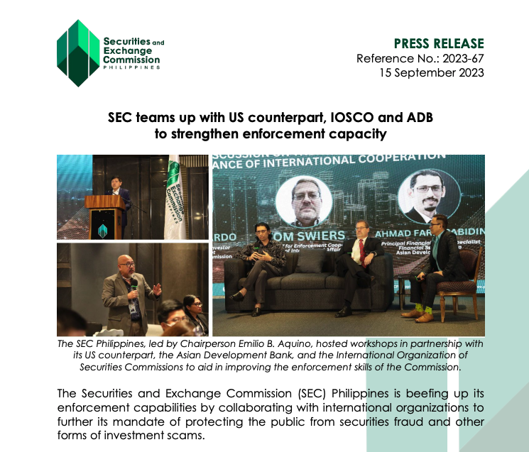 The Securities and Exchange Commission (SEC) Philippines collaborating with international organizations to further its mandate of protecting the public from securities fraud and other forms of investment scams.