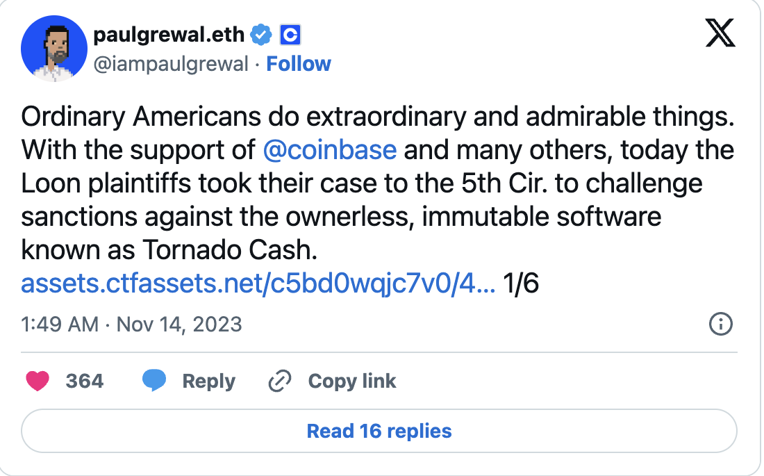 Coinbase Chief Legal Officer Paul Grewal expressed support for the plaintiffs’ efforts in a tweet on November 13, stating that the appeals court should carefully consider the petition. The crypto exchange has openly backed Van Loon and the other plaintiffs since the lawsuit was filed in September 2022.