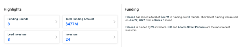 FalconX has raised substantial funding to $477 million over eight rounds, with notable contributions from GIC and Adams Street Partners. The most recent funding round, Series D, raised $150 million in June 2022, led by B Capital and GIC.