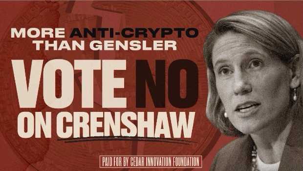 The Cedar Innovation Foundation, a dark-money group backed by undisclosed crypto interests, has launched a digital ad campaign labeling Crenshaw “more extreme” than Gensler, citing her opposition to spot Bitcoin ETFs and her “petri dish” remark.