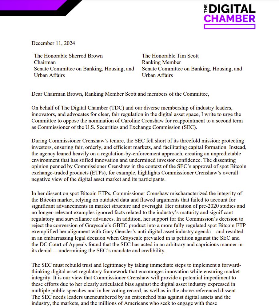The Digital Chamber, an American advocacy group focused on promoting blockchain technology and digital asset industry, has publicly urged the Senate Banking Committee to reject the nomination of SEC Commissioner Caroline Crenshaw for a second term.